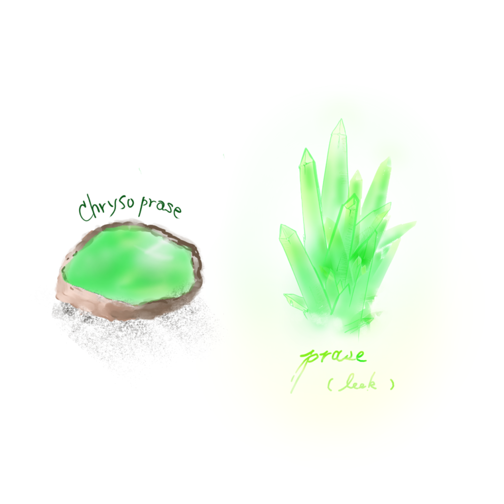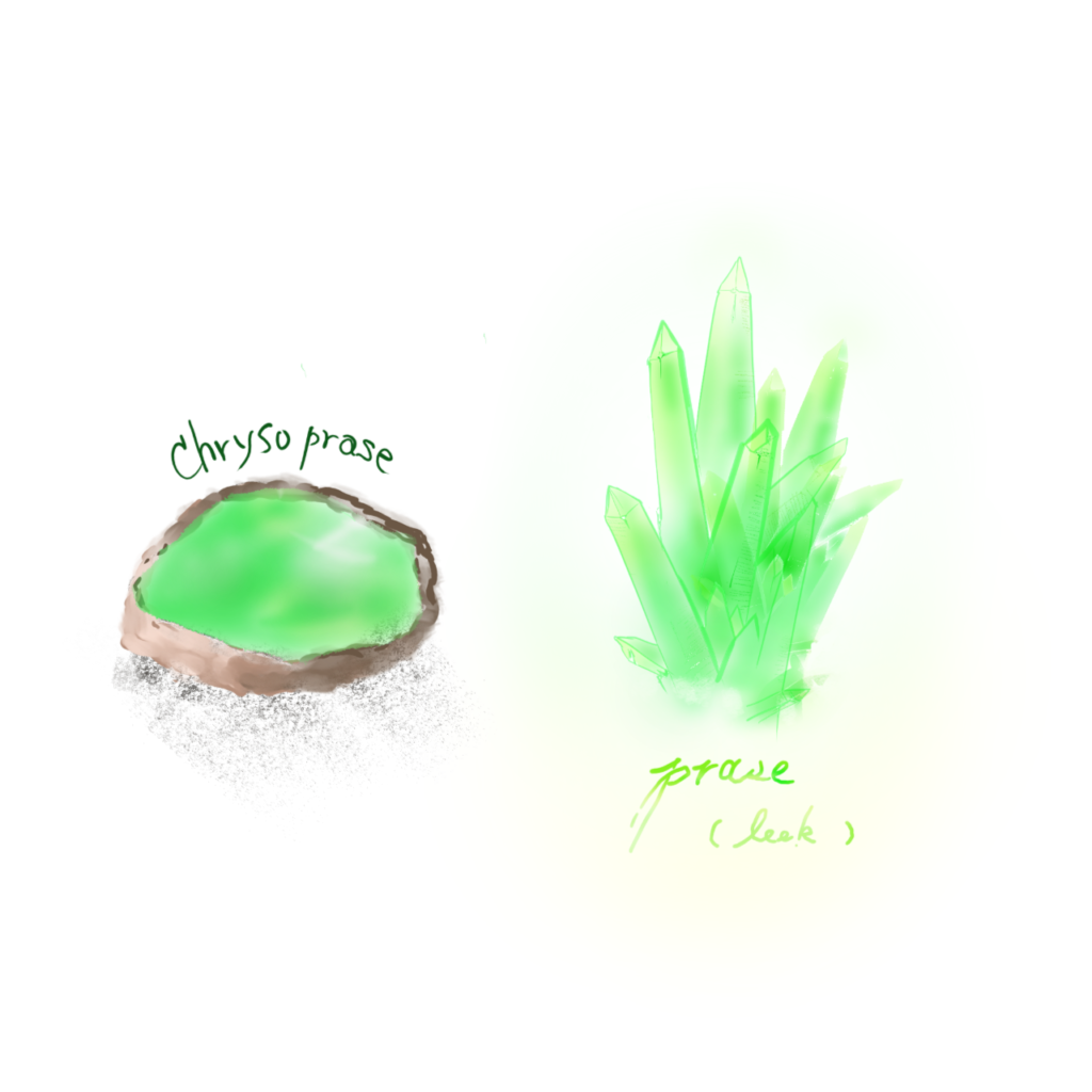黄緑色(leek-green)の水晶の原石(絵:右)があったら、確かにニラやネギを思わせるような気がします。