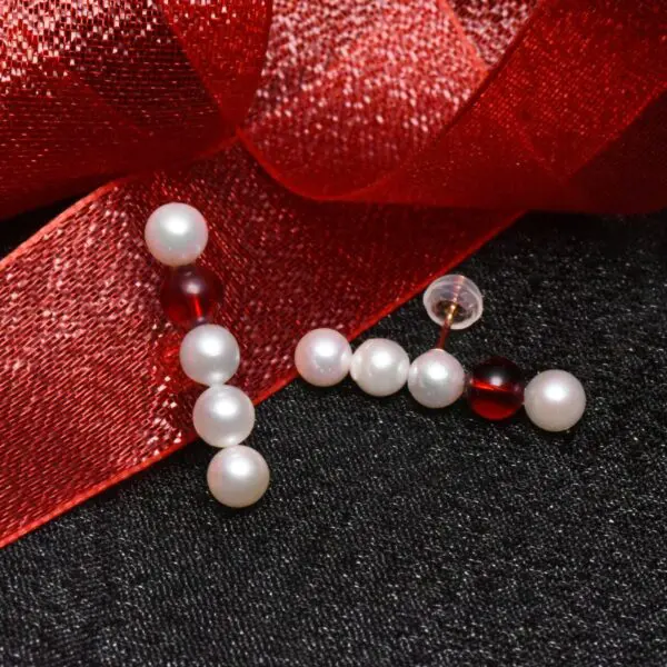 ■ シンプルでちょっと都会的なバーデザインのピアス。素材はアコヤパールと草花で染めたアンバーです。約5~5.5mm前後の珠が5つ並べられ、全体の幅があるのでしっかり主張してくれます。ホワイト系のパールとルビー色のアンバーにピンクゴールドの組み合わせで、顔元に情熱的な雰囲気と上品さを同時にまとわせてくれるデザインに仕上げられています。